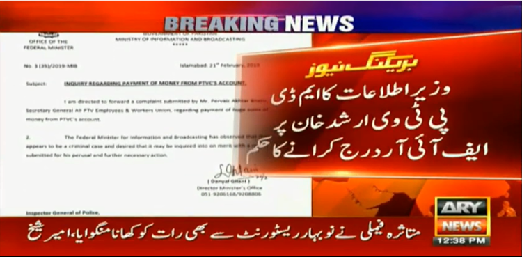 ISLAMABAD: Federal Minister for Information and Broadcasting Fawad Chaudhry on Friday ordered to lodge a First Information Report (FIR) against Managing Director Pakistan Television (PTV) Arshad Khan, over transfer of hefty amount from its account.