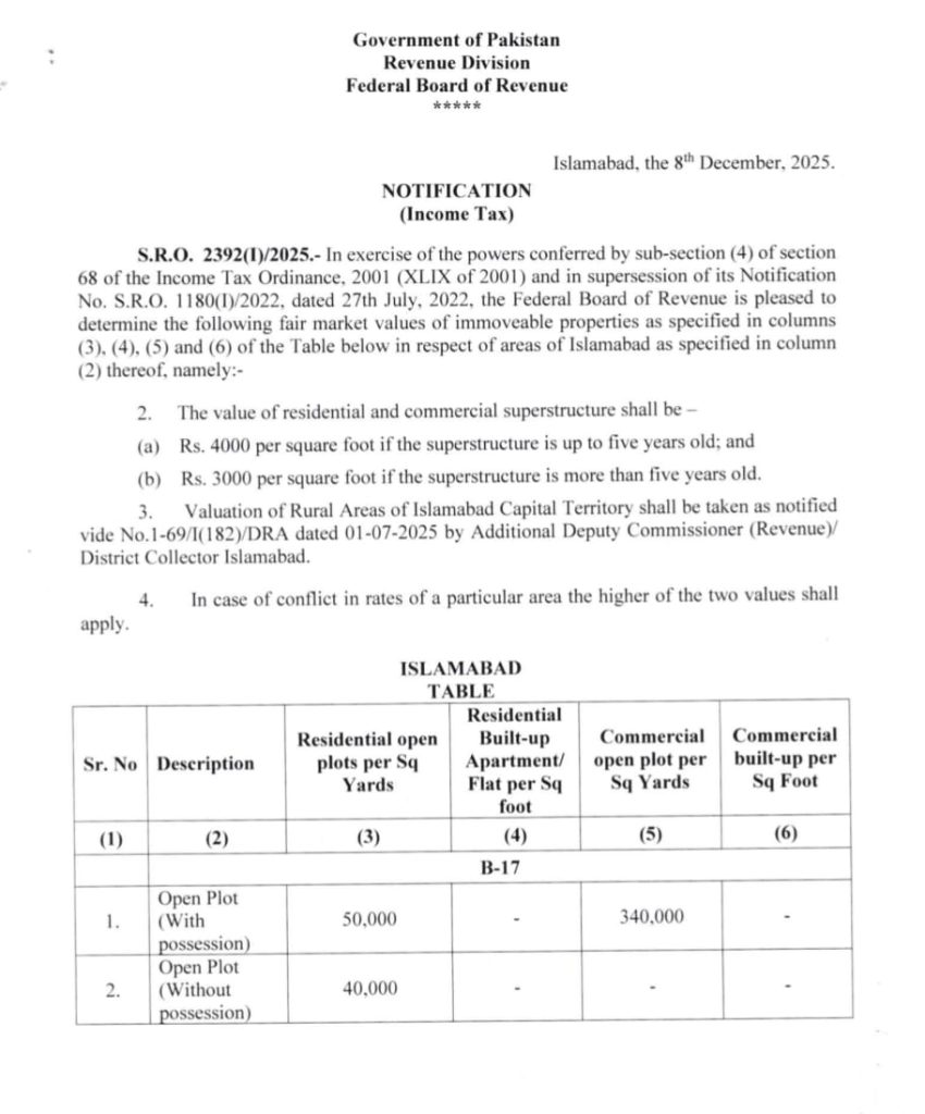 Under SRO 2390, new valuation rates have been applied for the purchase and sale of properties in the federal capital.