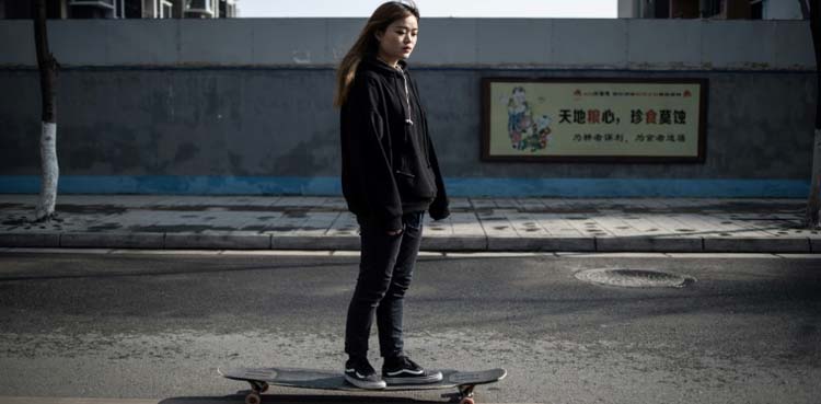 Longboarder Mu Qing skates through the mega-city of Chengdu in southwest China, deftly dancing on and off her ride as a friend tails her from behind, filming on a smartphone.