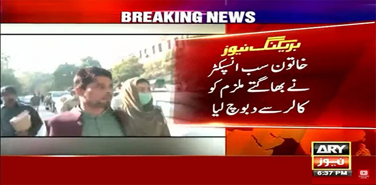LAHORE: A female police officer became the centre of the applause for witnesses when a female police officer nabbed a person accused of sexual assault trying to flee the court, ARY News reported.