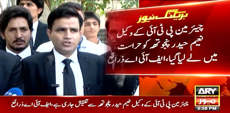 Sources told ARY News that the investigation agency had detained PTI chief’s lawyer while interrogation in a case related to alleged Facebook posts was underway.