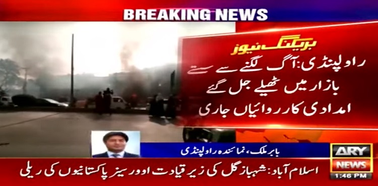 As per details, the fire broke out at the sasta bazar located at the Chohar Chowk Rawalpindi. Several pushcarts were turned into ashes due to raging fire.