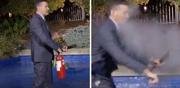 VIDEO: Fire extinguisher explodes in weather presenter's hands