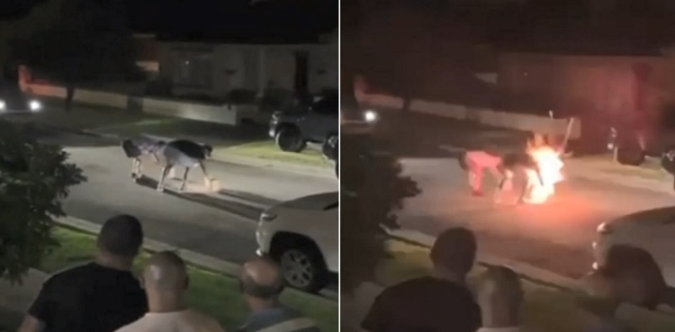 Confronting footage of the botched blast, shows the man igniting the firework in the middle of a Punchbowl road on Christmas Eve before it shoots directly into him.