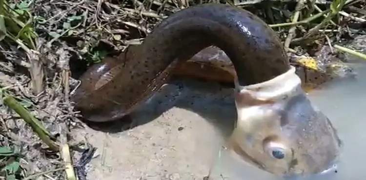 A bizarre video going viral on Twitter appears to show a fish swallowing an eel, but viewers are sure that there is something dubious about the whole thing.
