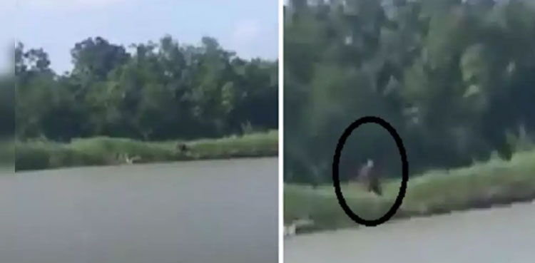 When the grainy footage starts, the creature loitering around the banks looks much like a dog. But as it rolls on, the figure suddenly becomes big after standing up.