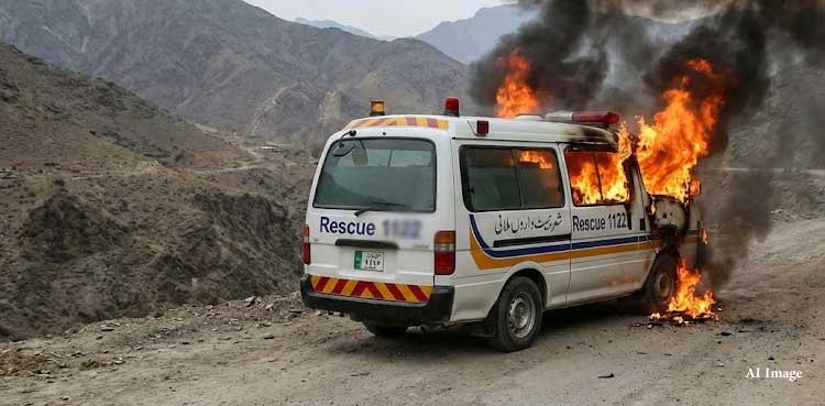 KARAK – In a display of extreme inhumanity that has sent shockwaves across the country, terrorists belonging to Fitna al-Khawarij targeted a Rescue 1122 ambulance on February 23, 2026, setting it ablaze and burning wounded Federal Constabulary (FC) personnel alive.