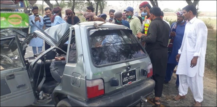 According to the details, a local trader Muhammad Irshad along with his family was on his way home when their car collided with the Mazda near Adda Mana Mor in Burewala.