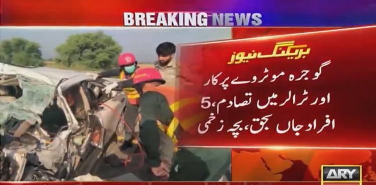 GOJRA: At least five people, including a woman, were killed in an accident on the M4 motorway on Sunday, ARY News reported.