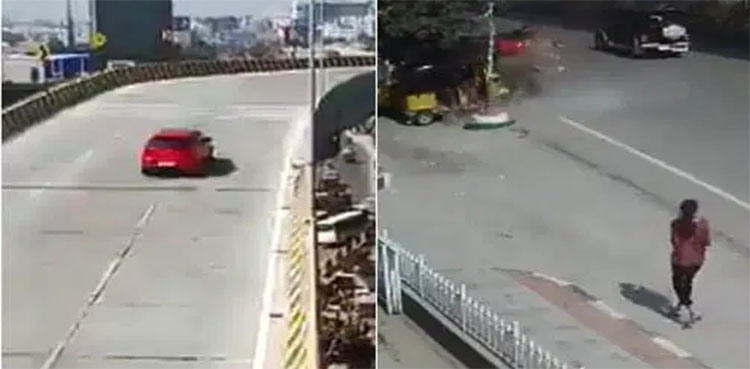The incident occurred in Hyderabad, capital of Indian state Telangana, and was captured on CCTV cameras. Indian media reports say that the mishap took place when the car which was speeding at 104 km/hour lost control and fell off the flyover at Biodiversity Junction in Hyderabad’s Raidurgam after it crashed into the divider. The car driver sustained injuries and was admitted to the intensive care unit of a hospital in the city.