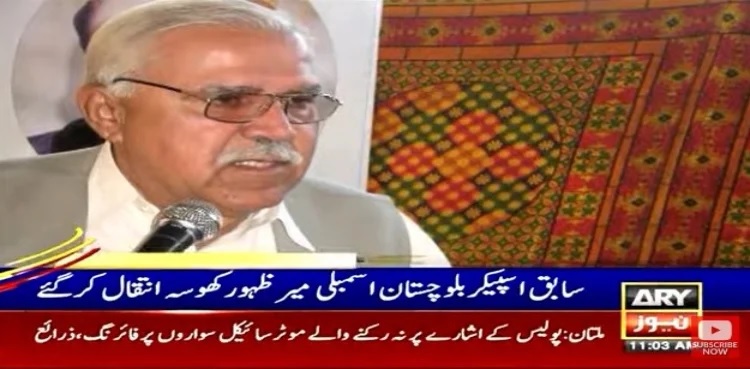 JAFFARABAD: Former Balochistan Assembly speaker Mir Zahoor Hussain Khosa on Sunday passed away after a prolonged illness, ARY News reported, quoting family sources۔