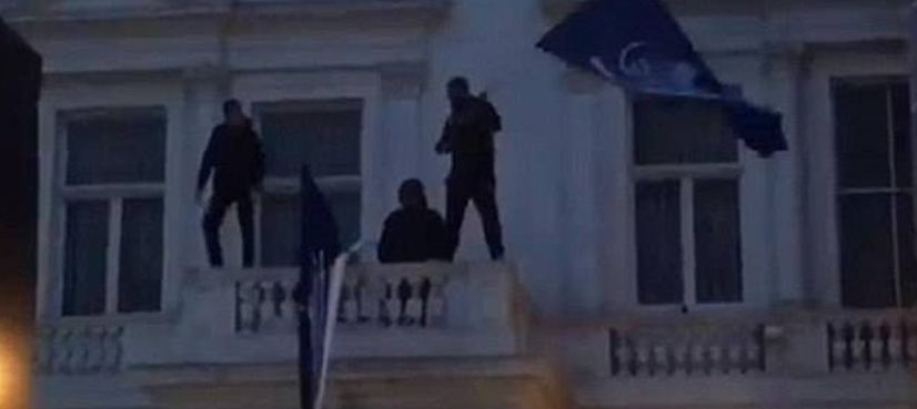 Images posted on social media showed four men in black attire on the balcony of the embassy, waving a blue and white flag.