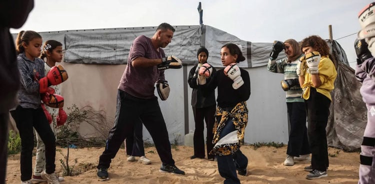 Khan Yunis: In a makeshift boxing ring etched into the sand between the tens of displaced Palestinians in southern Gaza, a dozen young girls warmed up before delivering fierce blows at their coach’s command.