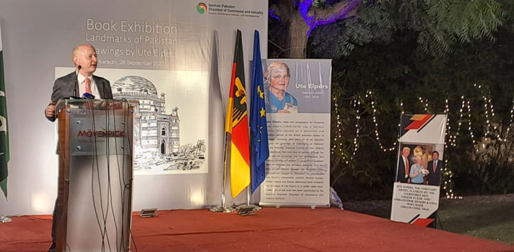 German Consul General in Karachi Dr Rudiger Lotz said, “Tonight it is an event where we do not talk [about] politics or business but about culture. The book has landmarks covering the country, all four provinces of Pakistan. We have in the book the Faisal Mosque in Islamabad and the Quaid-i-Azam Mausoleum in Karachi… and so on. What I found particularly charming is the old who loved this country, its people and culture and started to take her ink and pen to draw these buildings and the love of the country which she had never seen.