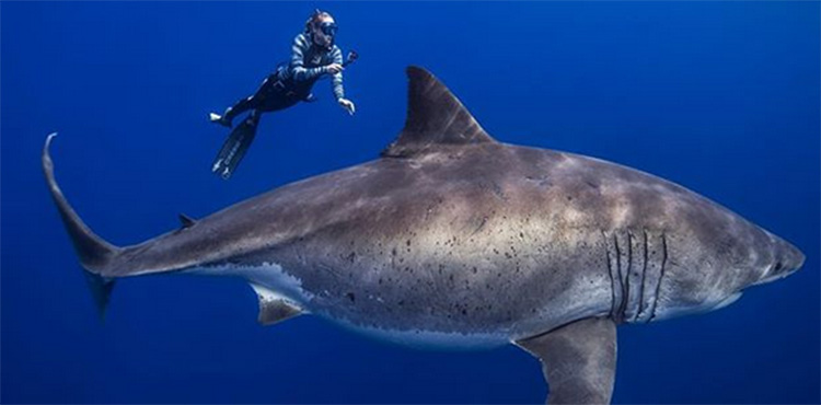 Divers in Hawaii state of United States were watching a school of tiger sharks feast on a dead whale on Tuesday when a much bigger fish appeared out of the depths.