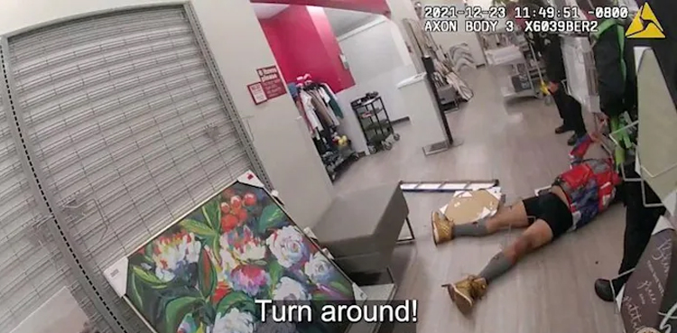The suspect, holding the bike lock and another large object in his hands, is seen standing with his back to the outside of the fitting room, several steps from the bleeding victim as the officer raises his rifle and fires three shots at him.