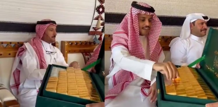 At a lavish Saudi wedding, the bride’s brother is seen in a video circulating on social media, presenting gold-coloured bar-like treats to guests, capturing attention online.