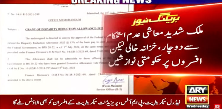 Informed sources told ARY News that all the officers of grade 17 to 22 under the establishment division will get an allowance. The notification further said that the officers of the Federal Secretariat, PM Office, and President Secretariat will also get an allowance.