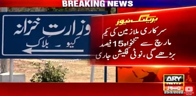 ISLAMABAD: The federal government on Wednesday notified 15 percent raise in salaries of federal government employees from March 1, ARY News reported.