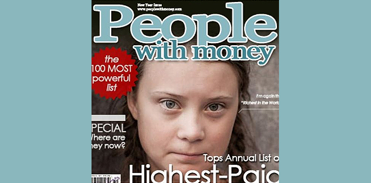 It purports to show teenage climate change campaigner Greta Thunberg on the front cover of a magazine called “People With Money”.