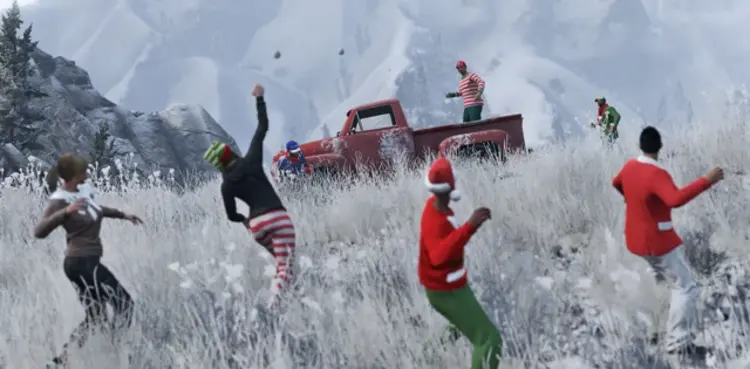 In the Christmas event, Los Santos is replaced with snow blizzards as players abandon gunfights and take up light-hearted snowball fights.