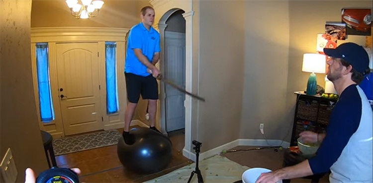 David Rush, who has broken more than 150 Guinness records to promote STEM education, stood on a Swiss ball and wielded the samurai sword while neighbor Jonathan Hannon threw the grapes into the air.