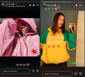 Timothée reposted both photos on his Instagram Stories, adding emojis to each. He added three Brazilian flags and a fire emoji for Hailey’s picture, nodding to her Brazilian roots while three goat emojis along with Justin’s song Speed Demon for the pop star’s post.