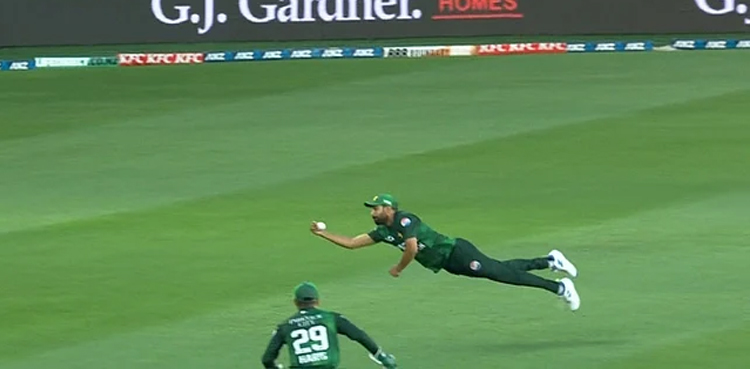 Haris, diving towards his right-hand side and grabbed a stunning catch, from his own reaction it appeared that he himself couldn’t believe what had happened.
