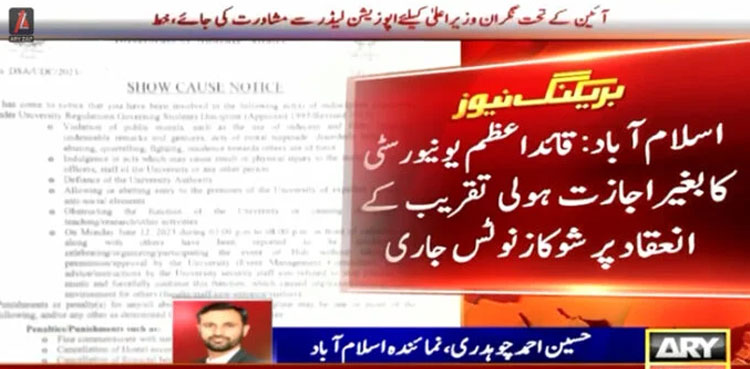 ISLAMABAD: The administration of the Quaid-i-Azam University (QAU) has served show cause notices to the students and staffers for celebrating the Hindu festival of Holi without getting prior permission, ARY News reported on Friday.