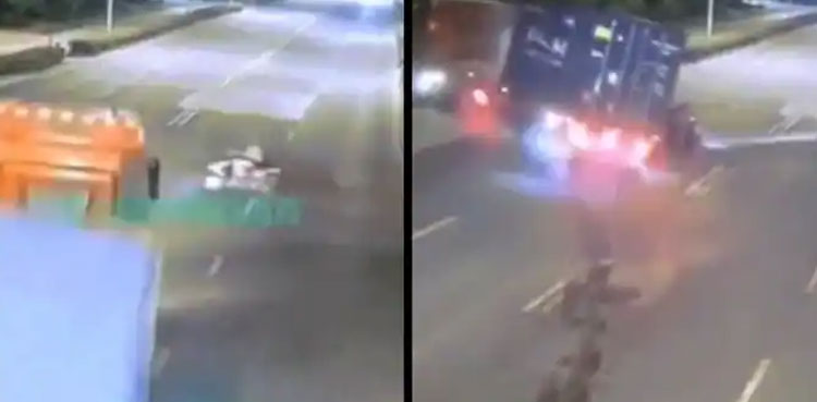 Indian Police Service (IPS) officer Dipanshu Kabra shared the viral video on the micro-blogging platform. It showed the motorcyclist coming in front of the speeding truck.