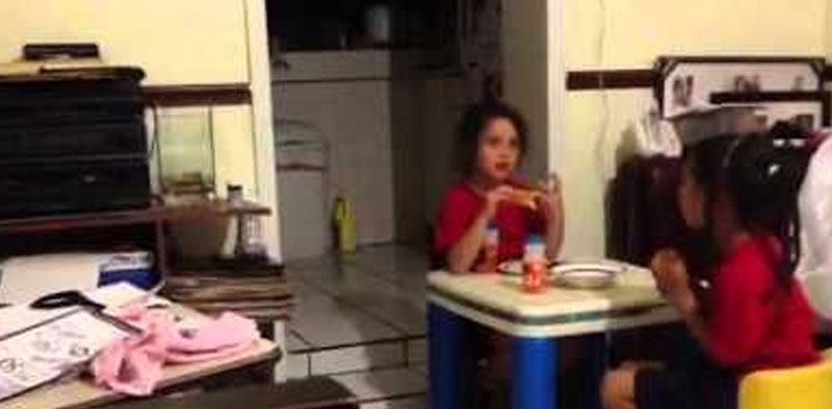 The video clip shared on social media platforms shows two friends eating at a small plastic table when the girl facing into the darkened kitchen begins trying to look around the corner and making sounds of distress.