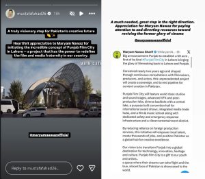 “A truly visionary step for Pakistan’s creative futureHeartfelt appreciation to Maryam Nawaz for initiating the incredible concept of Punjab Film City in Lahore – a project that has the power to redefine the film and media fraternity in our country,” he wrote on Instagram.