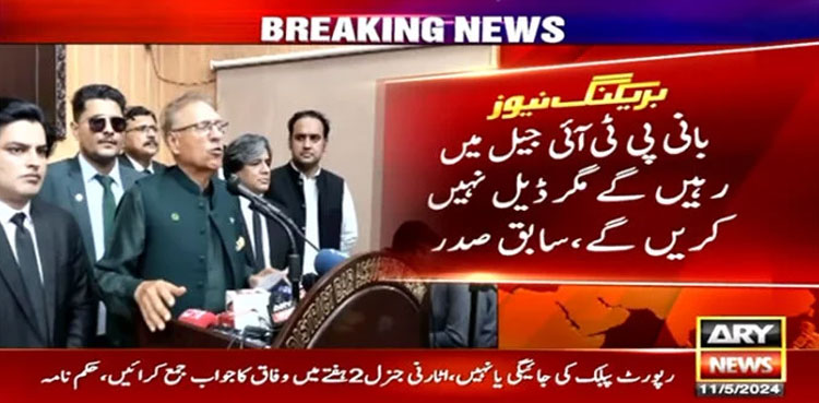 SIALKOT: Former president Arif Alvi on Saturday asserted that Pakistan Tehreek-e-Insaf (PTI) founder Imran Khan, who is incarcerated in Adiala Jail, would prefer remaining behind bars rather than making ‘any deal’, ARY News reported.
