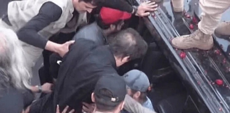 Imran Khan and several other PTI leaders sustained injuries after a man opened fire near the PTI reception camp at Allahwala Chowk during party’s long march.