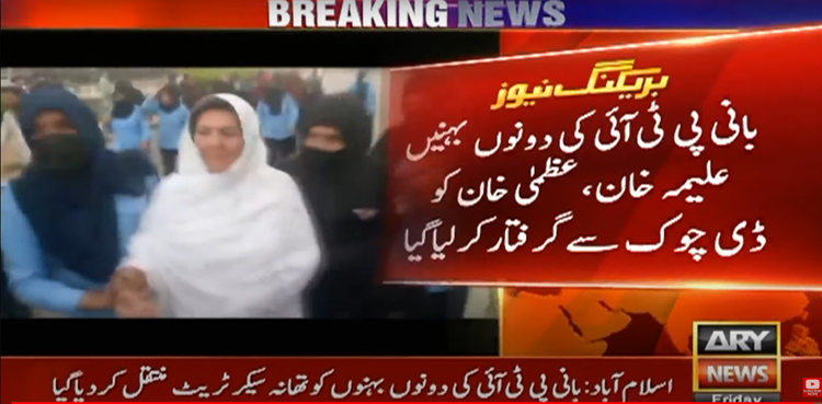ISLAMABAD: Islamabad police on Friday arrested two sisters of Pakistan Tehreek-e-Insaf (PTI) founder Imran Khan from D-Chowk, ARY News reported.