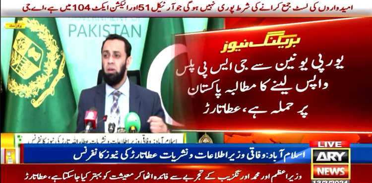 ISLAMABAD: Minister for Information and Broadcasting Attaullah Tarar on Wednesday said that the GSP Plus Status of Pakistan will remain intact regardless of the baseless campaign initiated by PTI online seeking its withdrawal, ARY News reported.
