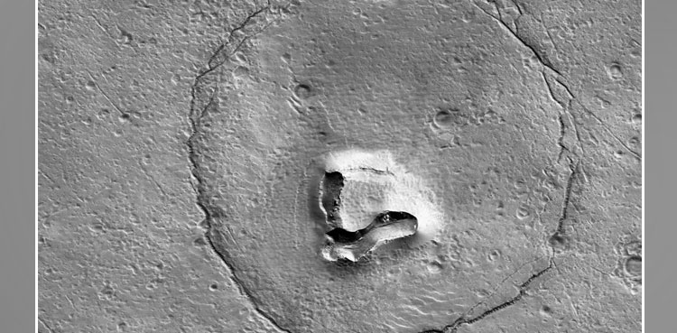 The beaming face of a cute-looking teddy bear appears to have been carved into the surface of our nearest planetary neighbour, waiting for a passing satellite to discover it.