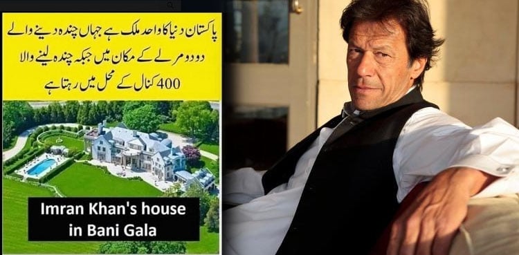 The image also includes text in Urdu that translates as: “Pakistan is the only country in the world where those who donate money live in a 2 marla house, while the one who takes donations lives in 400 kanal palace.”