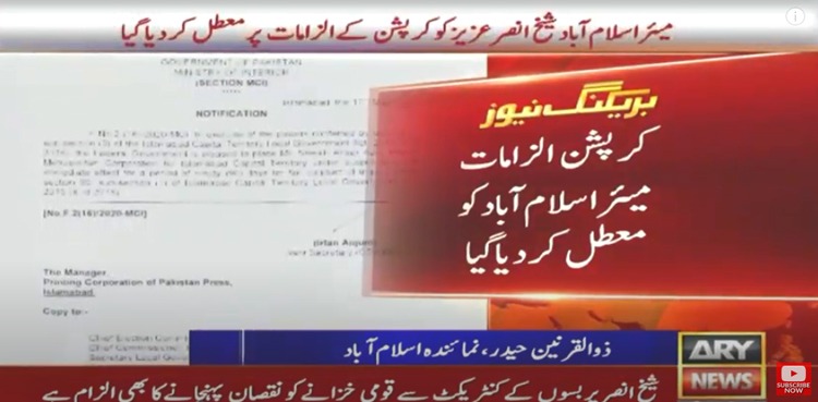 ISLAMABAD: The federal government on Sunday suspended Islamabad Metropolitan Corporation (IMC) Mayor Sheikh Anser Aziz over corruption allegations, ARY News reported,