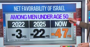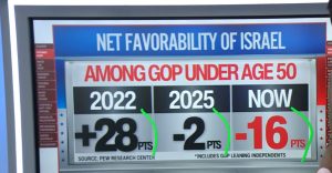 The data also shows changing attitudes among younger male voters, a key part of Trump’s 2024 coalition. Favorability toward Israel among men under 50 declined from -3 points in 2022 to -47 in 2026.