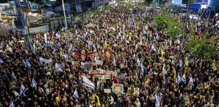 Tel Aviv: Thousands of demonstrators massed in Tel Aviv on Tuesday, seeking to push the government to end the war in Gaza and strike a deal to return hostages, as the security cabinet convened.