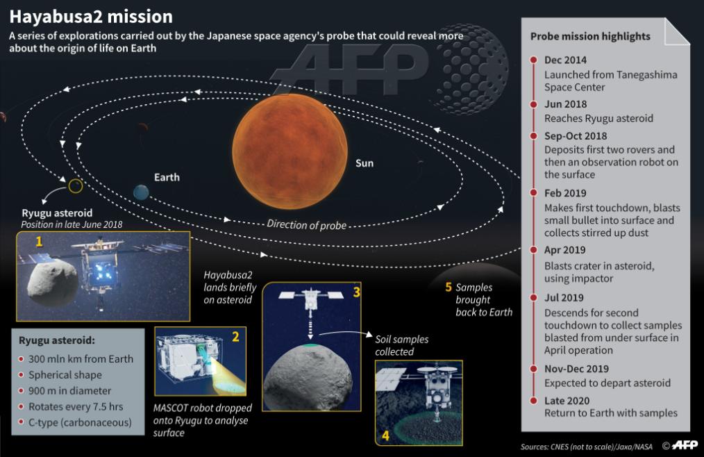 By early afternoon, JAXA said the probe had descended around five kilometres and was on track to touchdown Thursday on the Ryugu asteroid, some 300 million kilometres (185 million miles) from Earth.