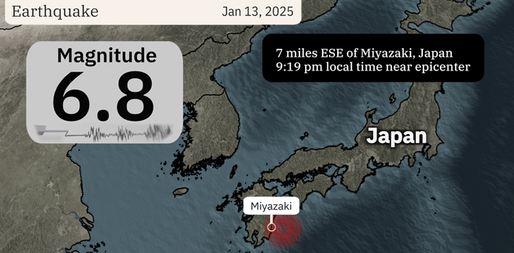 After Monday’s quake, tsunami advisories for waves of a maximum height of one metre (3.3 ft) were issued for the southern prefectures of Miyazaki and Kochi. A 20-centimetre (7.8 inches) tsunami was later recorded reaching Miyazaki city, public broadcaster NHK reported.