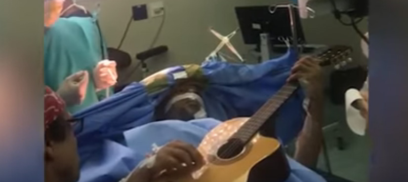 A video of the multi-instrumentalist and university lecturer taken during the six-hour surgery for a brain tumour, shows him lying on his back in the operating theatre, surrounded by scrubbed-up medical staff, plucking the strings of his guitar.