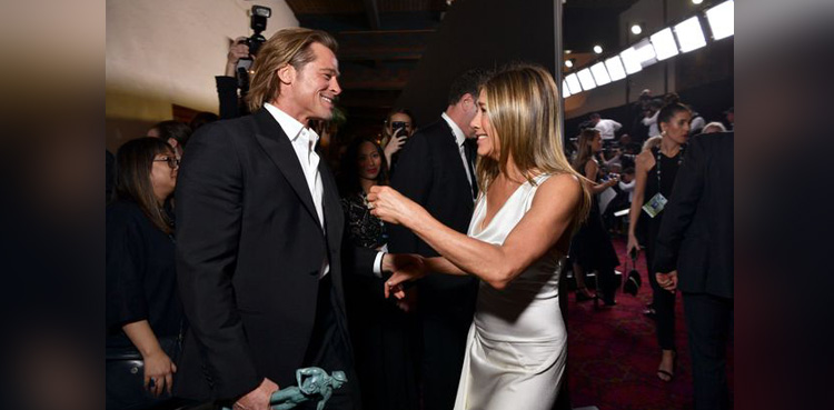 Jennifer Aniston and Brad Pitt reunite backstage at award show