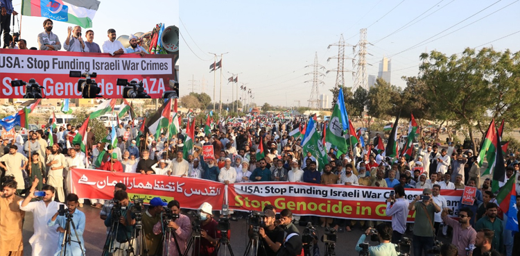 KARACHI: Jamaat-e-Islami (JI) held a massive protest rally outside the US consulate in Karachi, condemning Israeli aggression in Gaza and demanding the US stop funding Israeli war crimes.
