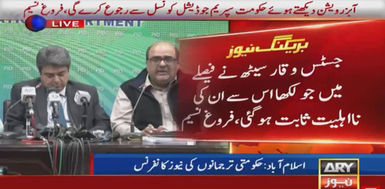Addressing a joint press conference along with Special Assistant to PM on Information and Broadcasting Firdous Ashiq Awan and Special Assistant on Accountability Shahzad Akbar, Farogh Naseem said that the Judge’s observation in the case proved him incompetent.