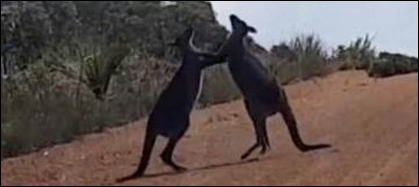 Mark Mallone captured video Friday on Australia’s Kangaroo Island of the two roos blocking a dirt road by punching, kicking and wrestling.