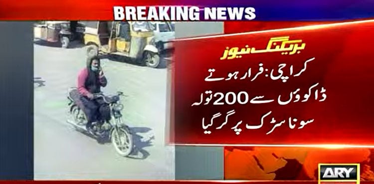 KARACHI: A daring robbery in Bahadurabad, Karachi, took an unexpected turn when nearly 200 tolas of stolen gold fell onto the road after the fleeing robbers lost control of their motorcycle, as captured on CCTV, ARY News reported.