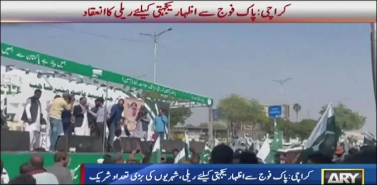 KARACHI: The citizens of Karachi have staged a large rally to show their solidarity with the Pakistan Army and admired its sacrifice rendered for defence and prosperity of country, ARY News reported on Sunday.
